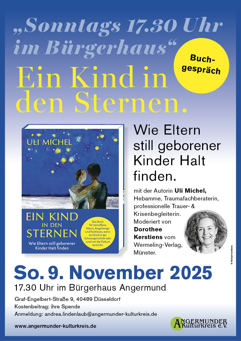 9 November @ 17:30 - 21:00 „Sonntags 17.30 Uhr im Bürgerhaus“: Ein Kind in den Sternen. Buchgespräch Bürgerhaus Graf-Engelbert-Str. 9, Düsseldorf 9. Nov. 2025
